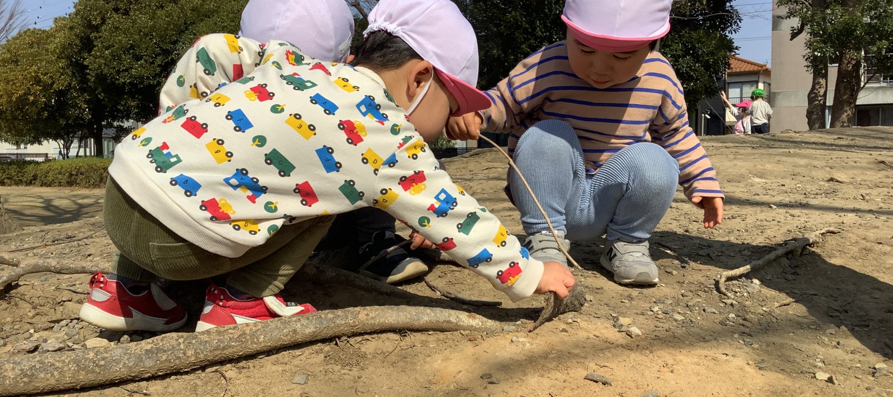 外に行くと友達と一緒に土の上や草むらに何かいないか観察に夢中になっている姿が見られます。