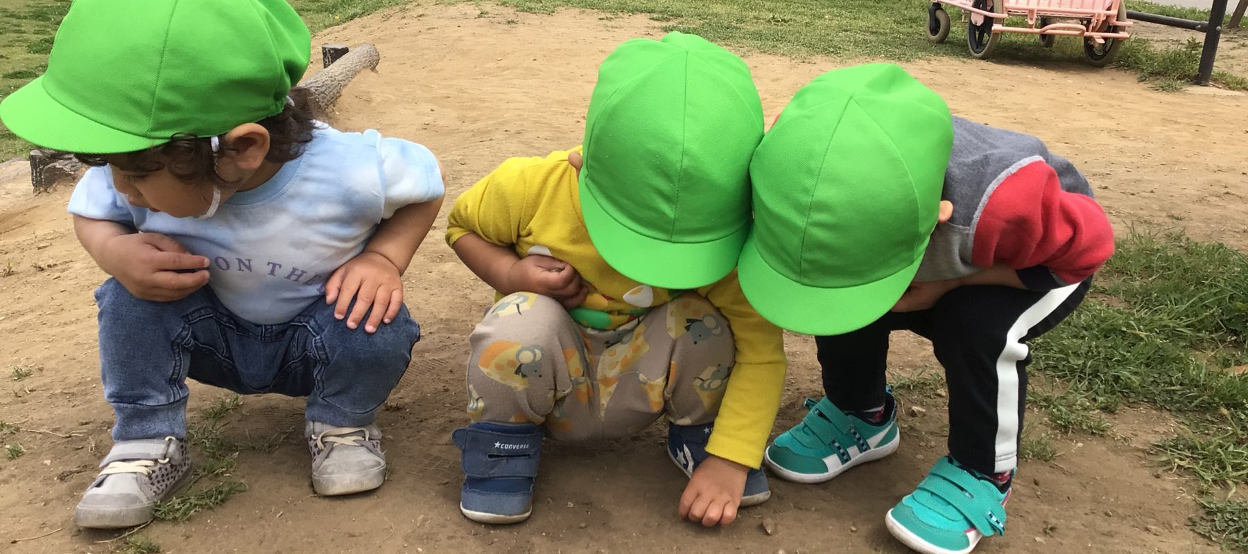 園庭でアリ探し。「ありさんはどこにいくのかな」真剣に探している可愛い姿です。