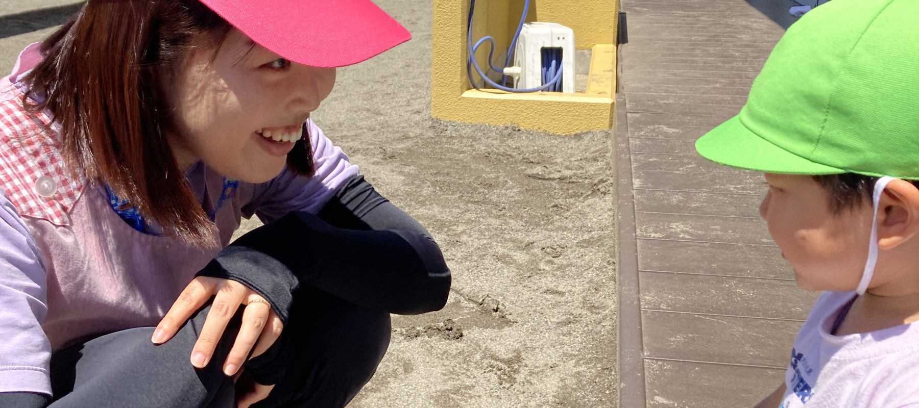 園庭で遊ぶ準備です。どうやら先生とお話し中。「くつがはけたよ」「なにしてあそぼうか」「のどかわいたね」二人のやり取り気になりますね。