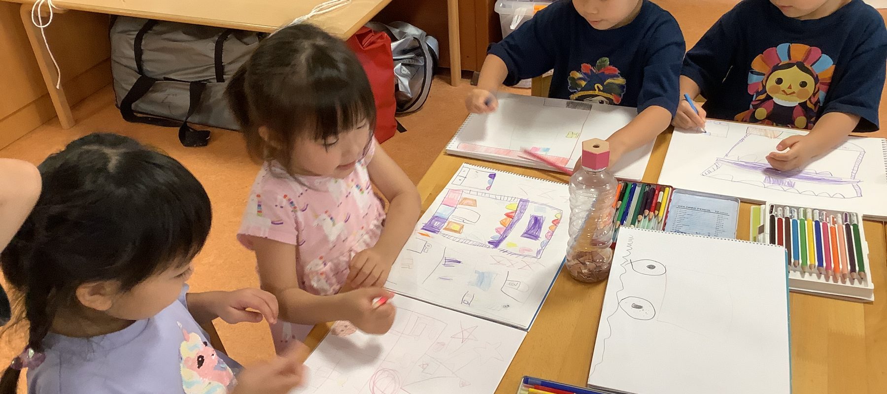 暑さ指数で外に出れない中でも、自由帳を使い自分の思い描いていることを絵にかいて表現しています。家庭の会話や職員が話している口調をまねていることもあります。覗き込むと「今ね~」と書いたものの説明は現実なのか。願望なのか?空想なのか?とても頼もしいです。