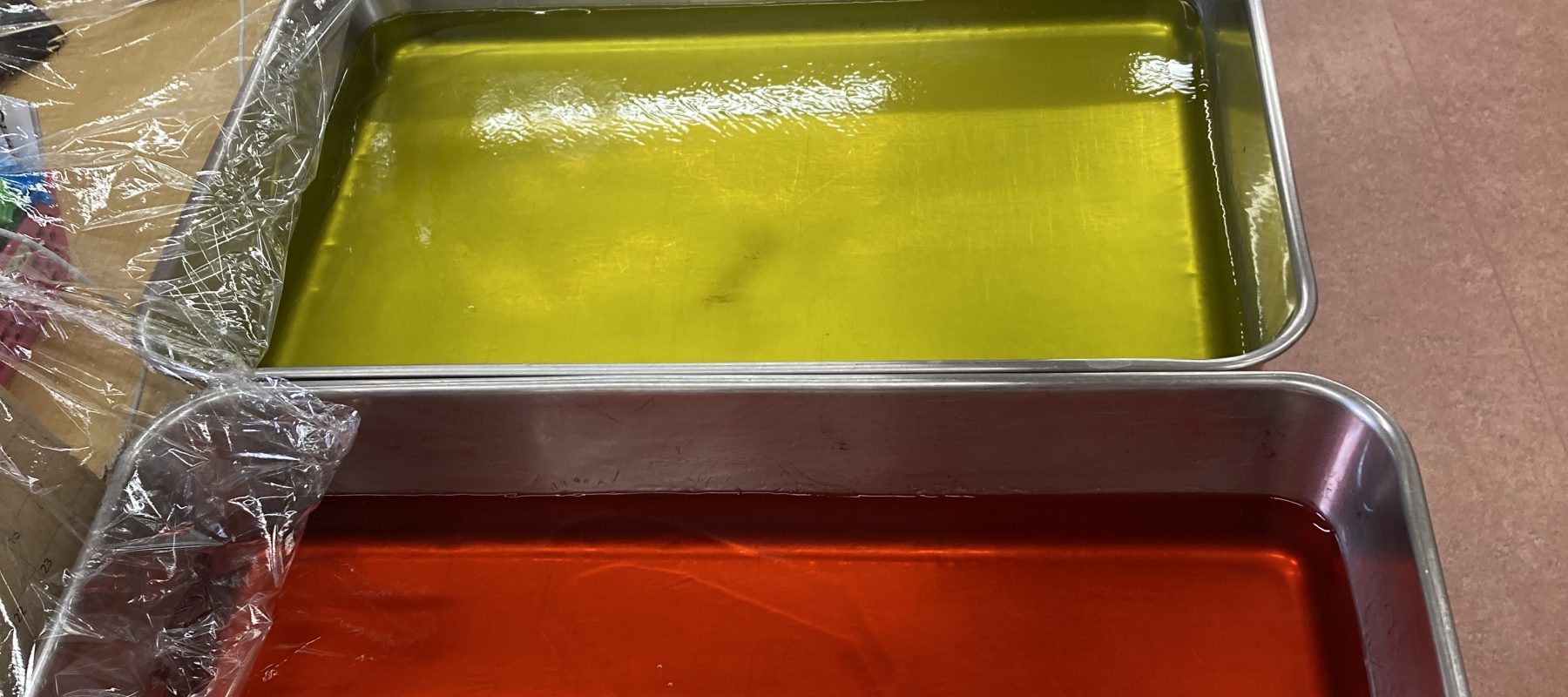 感触あそびの寒天を用意しました。触ることに抵抗があり、中々触れないこともありましたが、ツンツン触り確かめてから遊び始めました。