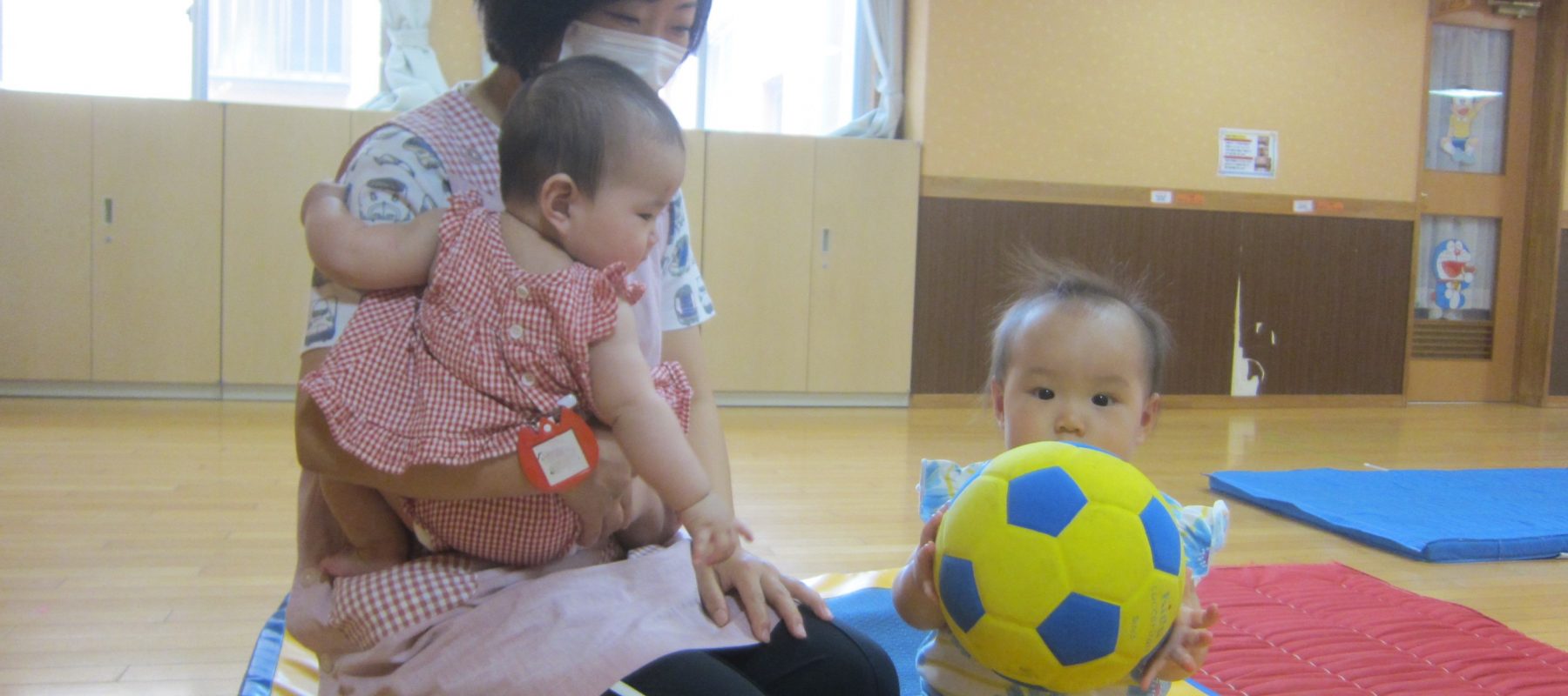 0歳児ひよこ組のお友達も少しずつ慣れ、ホールでもボールやフラフープ、トランポリンなどを使って体を動かして遊んでいます。