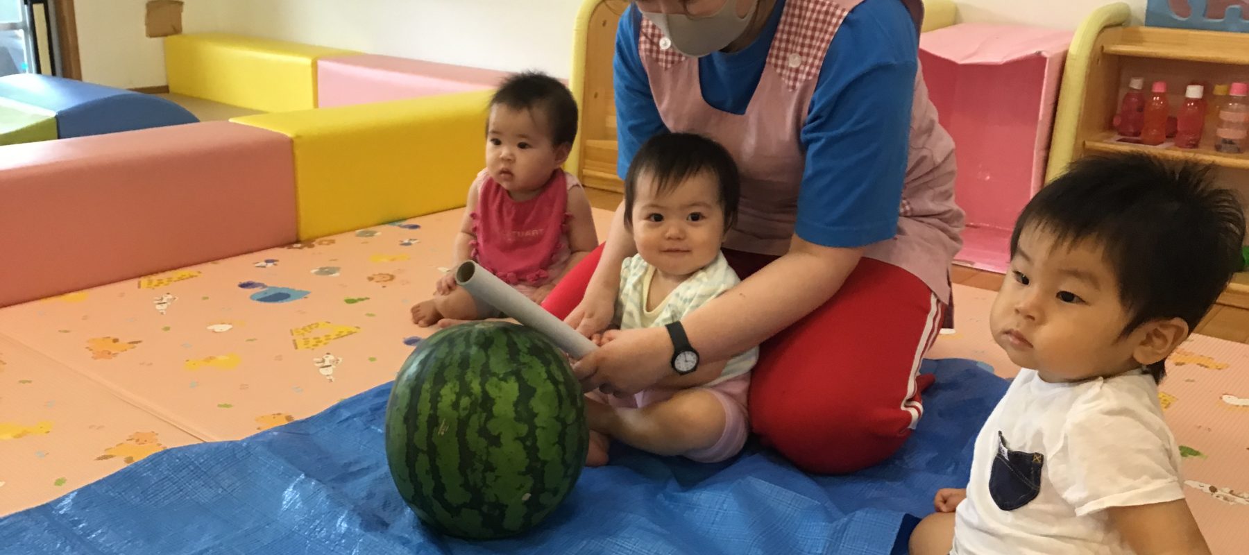 今日は夏のお楽しみ♪恒例のすいか割りを行いました。小さいクラスのお友達は大きなスイカに驚きながらも、触ってみたり、ギューっと抱きついたり、先生と棒で叩いてみたりと初めての体験を楽しみました。