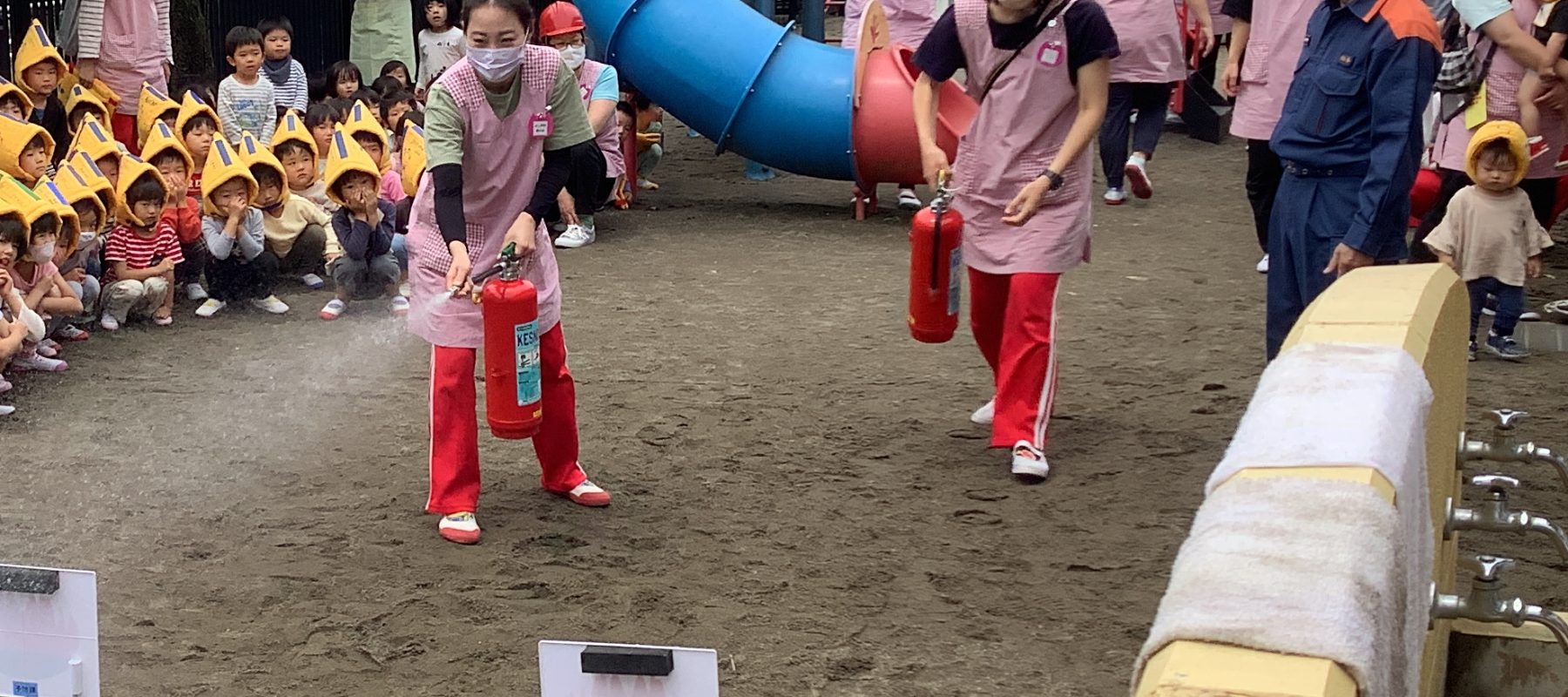 その後、先生たちは水消火の訓練も行いました。