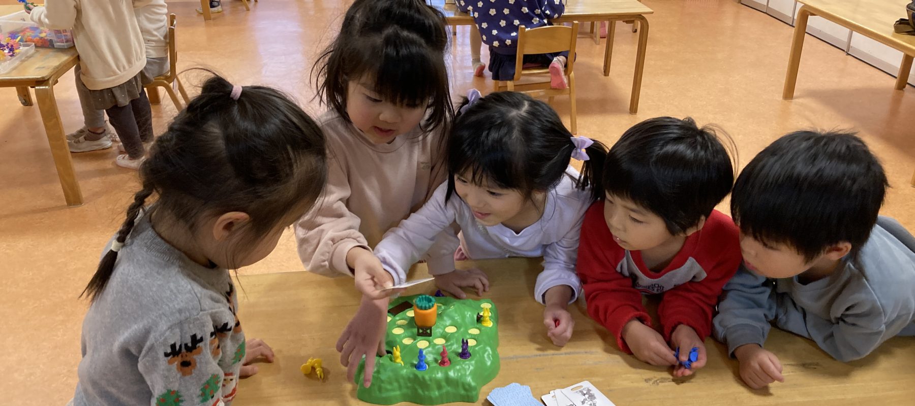 その後のゲームは「プレゼント運びゲーム」です。後ろを向いて次の人にプレゼントを送ります。落とさないように早く送りました。