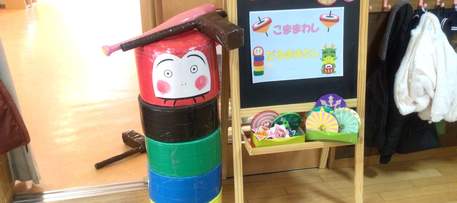 今日は「お正月遊び」がありました。こま回し・だるま落とし・はねつき・けんだま・福笑い・こままわし・凧つくりと沢山のコーナーを作りペアで自由に回りました。