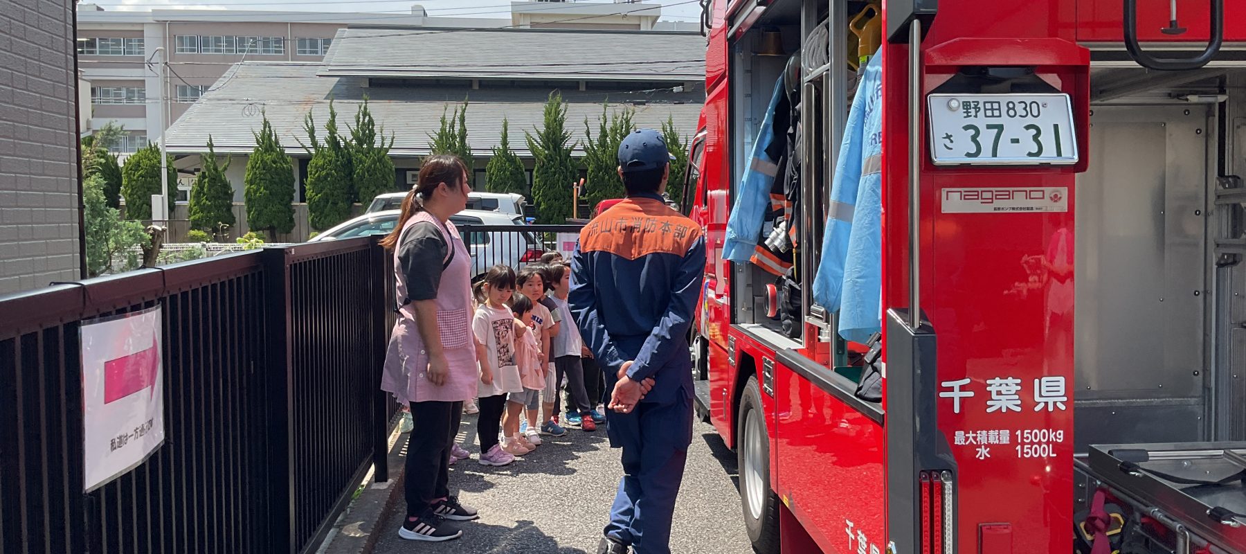 今月の避難訓練は、消防署の方にも来ていただきました。水消火の訓練をしたり、消防隊が災害現場に出動する時に着る防火服の早着替えも見せてもらいました!