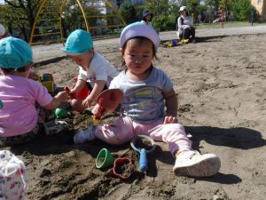 みかん組さんは、かえる公園で初めて砂場遊びに挑戦!スコップで掘ったり、手ですくった砂をカップに入れてみたりと夢中になって楽しんでいました。先生が作ったお団子を握って崩して感触を楽しむお友達もいましたよ。