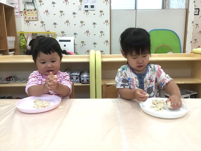 そのままのパン粉と、お水を足してからの感触の違いを楽しんだり、もみもみ、こねこねと言いながら形を丸めたりちぎったりして遊んでいましたよ。パンの良い匂いもして、鼻に近づけてクンクンしているお友達もいました☆